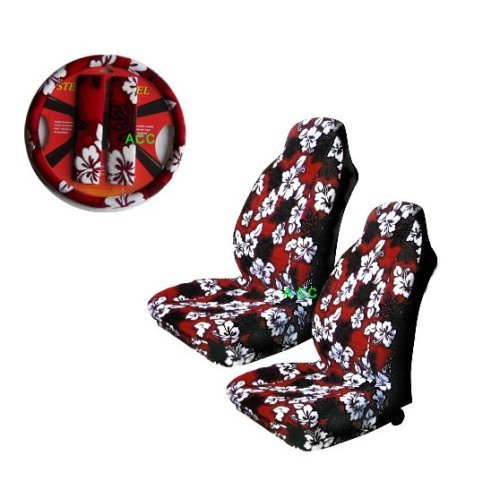 Tropical fun Hawaiian floral print seat covers are made from polyester to fit both low back and high back seats. Polyester promotes a refreshing feel to the touch. It will not stick to your skin and does not absorb heat or cold. It provides a more comfortable feel in both hot and cold environment. These seat covers are lined with urethane foam to provide additional cushion for comfort. It increases the value of your vehicle by protecting your seats from fading, wear and tear. There is no better way to protect your vehicle's seats while having a little fun with your vehicle. In addition, you also gets a matching steering wheel cover that protect your hands from the hot or freeezing steering wheel as well as two foam cushion shoulder harness cover the relief the pressure on your shoulder and chest.