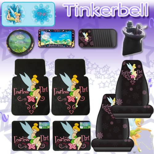 This is a 11 pieces Tinkerbell-Fearless Flirt Car Accessories Set includes 2 seat covers, 2 front and 2 back high quality rubber mats, CD visor organizer, plastic license plate frame, steering wheel cover, large sun shade and a air vent pocket pouch