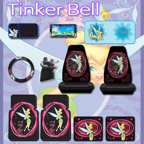 This is a 11 pieces Tinkerbell-Optical Tink Car Accessories Set includes 2 seat covers, 2 front and 2 back high quality rubber mats, CD visor organizer, plastic license plate frame, steering wheel cover, large sun shade and a air vent pocket pouch