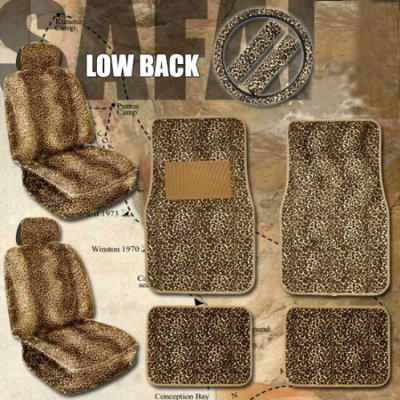 Total 12 pieces of Safari Leopard Print accessories set includes 2 pieces of Leopard seat covers with 2 separate head rest cover. Made with high grade heavy weight acrylic fabric with velvet and fury feel. These Low Back Leopard skin seat covers will fit any car SUV, truck or van with regular bucket seats. It will also fit seats with arm rest (zipper on the side). 2 front and 2 back pieces carpet Leopard print mat with nibbed tip backing. The front piece size is 27" X 17.25", rear size: 17.5" X 13.25" and Steering wheel cover (fits steering wheels with 14.5" ~16" diameter, 2 seat belt covers and a bonus air vent pocket pouch keep your personal stuff handy such like sunglass, pen even cell phone.