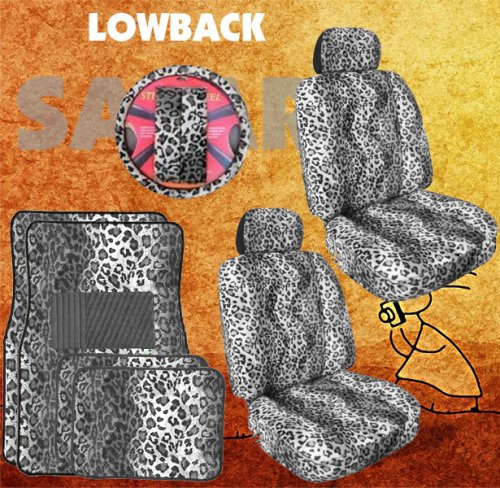 Total 11 pieces of Safari Leopard Print accessories set includes 2 pieces of Leopard seat covers with 2 separate head rest cover. Made with high grade heavy weight acrylic fabric with velvet and furry feel. These Low Back Grey Leopard skin seat covers will fit any car SUV, truck or van with regular bucket seats. 2 front and 2 back pieces carpet Leopard print mat with nibbed tip backing. The front piece size is 27" X 17.25", rear size: 17.5" X 13.25" and Steering wheel cover (fits steering wheels with 14.5" ~ 16" diameter, and matching 2 seat belt covers.
