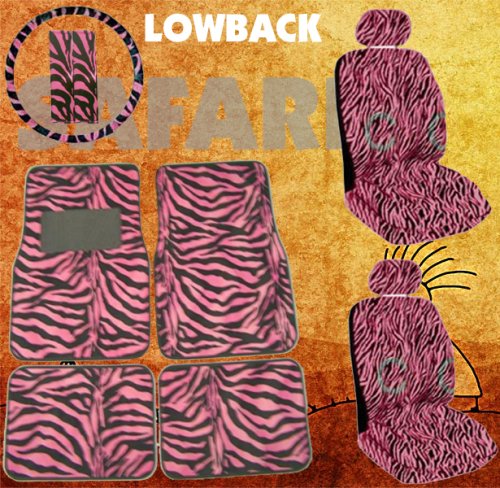 Total 11 pieces of Safari Zebra Print accessories set includes 2 pieces of Zebra seat covers with 2 separate head rest cover. Made with high grade heavy weight acrylic fabric with velvet and fury feel. These Low Back Zebra skin seat covers will fit any car SUV, truck or van with regular bucket seats. 2 front and 2 back pieces carpet Zebra print mat with nibbed tip backing. The front piece size is 27" X 17.25", rear size: 17.5" X 13.25" and Steering wheel cover (fits steering wheels with 14.5" ~16" diameter, and 2 seat belt covers.