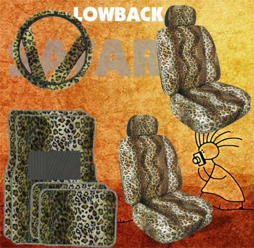 Total 11 pieces of Safari Leopard Print accessories set includes 2 pieces of Leopard seat covers with 2 separate head rest cover. Made with high grade heavy weight acrylic fabric with velvet and furry feel. These Low Back Tan Leopard skin seat covers will fit any car SUV, truck or van with regular bucket seats. 2 front and 2 back pieces carpet Leopard print mat with nibbed tip backing. The front piece size is 27" X 17.25", rear size: 17.5" X 13.25" and Steering wheel cover (fits steering wheels with 14.5" ~ 16" diameter, and matching 2 seat belt covers.