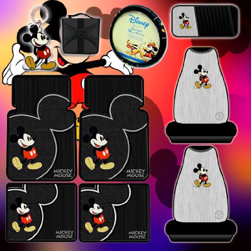 Plasticolor "molded-in" Mickey Mouse Vintage design floor mats. Heavy-duty Plastisol construction with recessed grid pattern. Universal size fits almost all vehicles. Size is 26" x 16.5" for fronts and 14" x 17" for rears. Plasticolor Mickey Mouse Vintage steering wheel cover. Universal size fits almost all wheels mostly sized between 14.5" - 15.5". Plasticolor Mickey Mouse Vintage seat covers. These are universal fit seat covers that are designed to fit most high or low back bucket seats that are equipped with a detachable or built-in headrest. The covers will not fit a seat that has a built-in armrest, built-in seatbelts, and/or air bags built into the seat itself. Adjustable with tabs and buckles to fit most bucket seats and to provide a smooth, custom fit. If your seat has a headrest, you will install the seat cover over the headrest after adjusting it to your desired position. Can be machine washed and are air dried. Plasticolor Visor Organizer holds 10 CDs on your vehicle sunvisor. Add fun and fashion to the normal features and functions of your sun visor. Matching key chian and bonus 24 discs CD wallet.