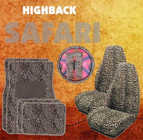 Total 9 pieces of Safari Tan Cheetah print accessories set includes 2 Cheetah print high back bucket seat covers. Made from high grade heavy weight acrylic fabric with velvet and furry feel. These Cheetah pattern seat covers will fit any car SUV, truck or van with regular high back bucket seats. Front & rear Cheetah print carpet floor mats with nibbed tip backing. The front mats measure 27" X 17.25", rear size: 17.5" X 13.25". Also includes steering wheel cover (fits steering wheels with 14.5" ~ 16" diameter, and 2 matching seat belt covers.