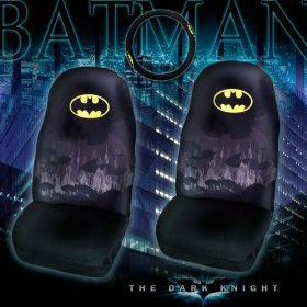 Product Description This is a latest set of the BATMAN Car Accessories. Set includes 2 seat covers and a steering wheel cover. 2 seat covers made of stretchable soft fabric that will fit all regular bucket seats low or high backs (covers the entire seat with head rest)This seat cover will NOT work on seats with arm rest or integrated seat belt. Rubber steering wheel cover rrotects hands from hot and cold temperatures. Provides extra grip and comfort on steering wheel Easy to install. Officially licensed
